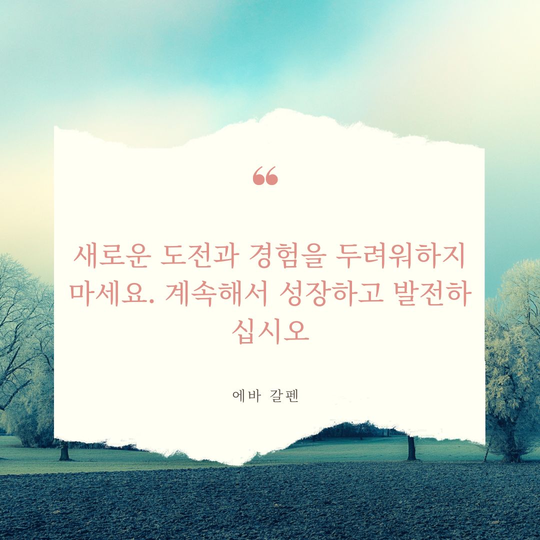 "새로운 도전과 경험을 두려워하지 마세요. 계속해서 성장하고 발전하십시오." - 에바 갈펜