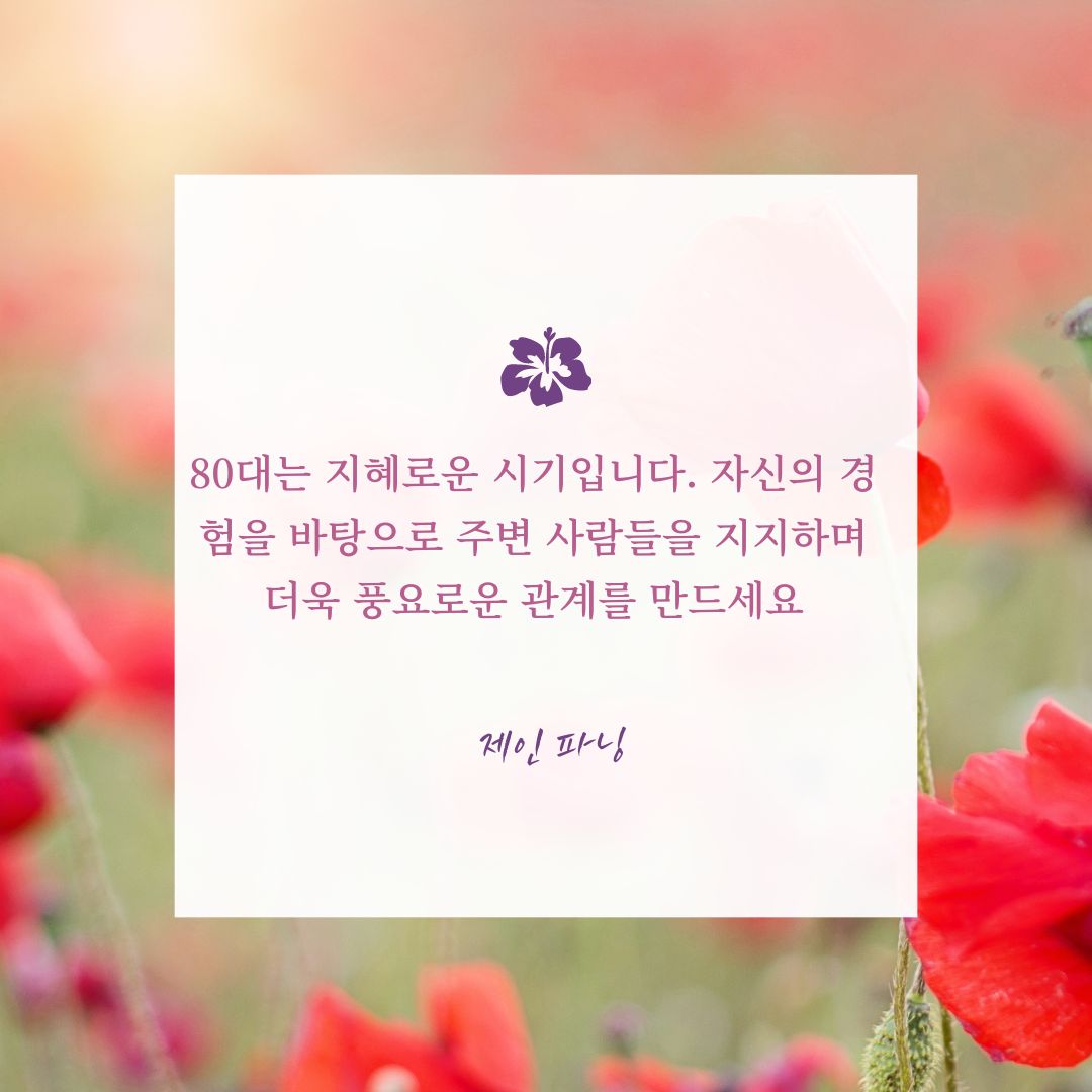 "80대는 지혜로운 시기입니다. 자신의 경험을 바탕으로 주변 사람들을 지지하며 더욱 풍요로운 관계를 만드세요." - 제인 파닝