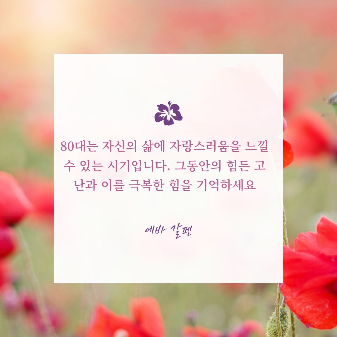 "80대는 자신의 삶에 자랑스러움을 느낄 수 있는 시기입니다. 그동안의 힘든 고난과 이를 극복한 힘을 기억하세요." - 에바 갈펜