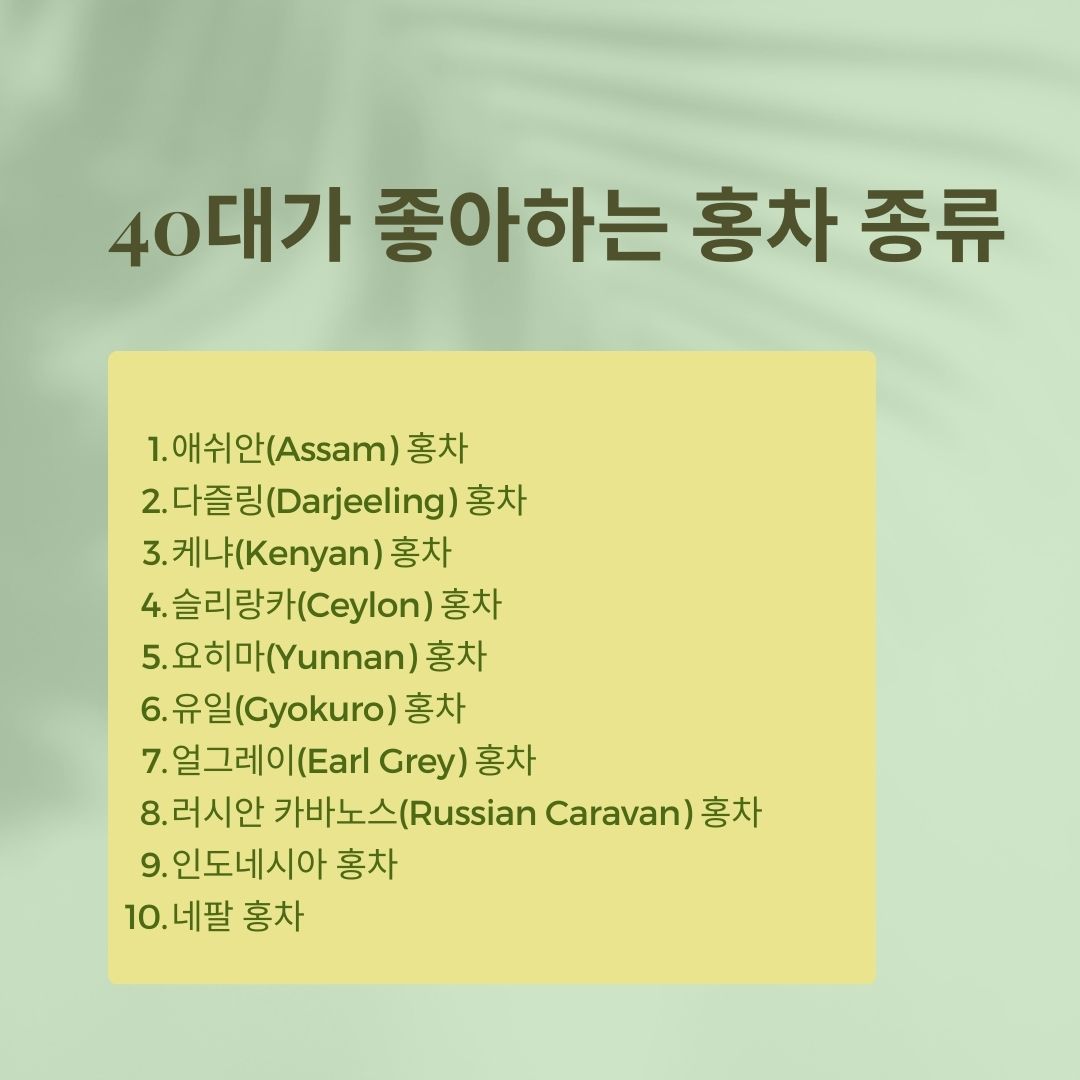 애쉬안(Assam) 홍차: 애쉬안 홍차는 강하고 풍부한 맛과 진한 색깔을 가지고 있습니다. 강렬한 향과 맛으로 아침 식사나 에너지가 필요한 때에 적합합니다.