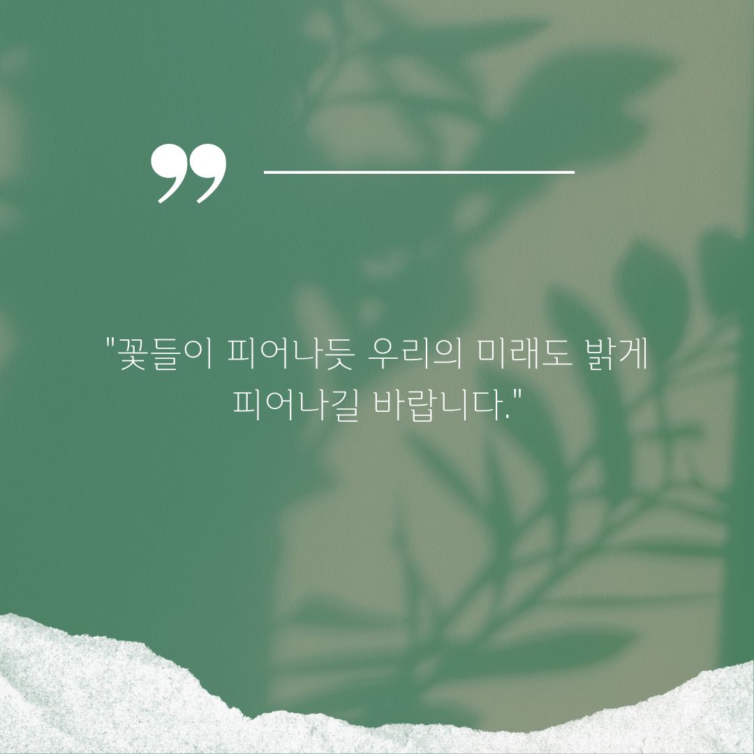 "꽃들이 피어나듯 우리의 미래도 밝게 피어나길 바랍니다."